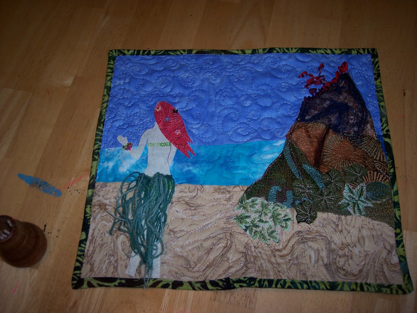 I have a little quilt to show. This is for the QA forum challenge called "It's My Nature". I'll let you decide if I'm the volcano or the Hula Girl! This was fun to make. It started out being just a landscape with the surf, sand, and volcano. I had all of that done. Lots of thread work on the volcano. But there was all this empty space. SO I thought....a Hula Girl. I had insomnia that night and couldn't sleep. So I got up, quickly drew her up and started fusing and sewing. An hour later I had my Hula Girl, named Coco. Later I used silk ribbon and wool thread to make her skirt and lava. The whole thing was machine quilted and bound. I don't like the binding, I usually do it by hand...but it is done now! Hope you like it. The quilt is called "Caution: Prone to Eruptions"