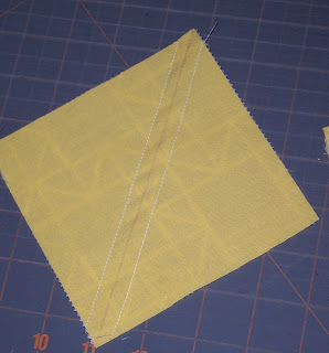 Take 1 grey squarer RS up and 1 yellow square RS down. Draw a line from point to point and sew 1/4 inch from both sides of the line. Make 4 of these. Cut on the line to make 8 half square triangle patches.